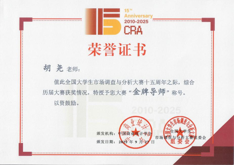 数学与统计学院胡尧教授获 “金牌导师”“新锐导师奖”,董珍副教授获 “银牌导师”“新锐导师奖”,研究生工作部邱利军老师获 “最佳组织奖”。