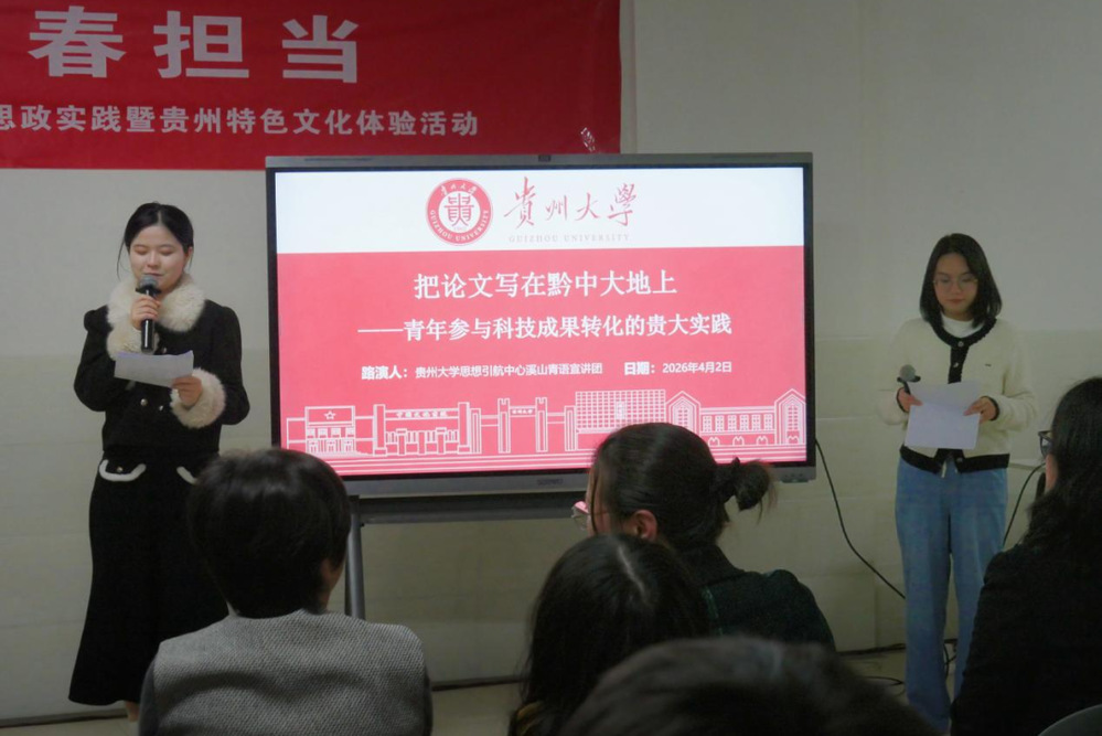 来自资源与环境工程学院2025级研究生陶虹、公共管理学院2023级研究生曹秋晚以《把论文写在黔中大地上——青年参与科技成果转化的贵大实践》为题,围绕党的二十届四中全会、省委十三届八次全会精神,系统阐述科技成果转化的重要意义,讲述了我校学子张建、涂汉、那彬彬扎根贵州、服务产业,把科研成果写在田间地头、转化为现实生产力,以实际行动诠释新时代青年责任与担当的典型事迹,让在场师生深受鼓舞。